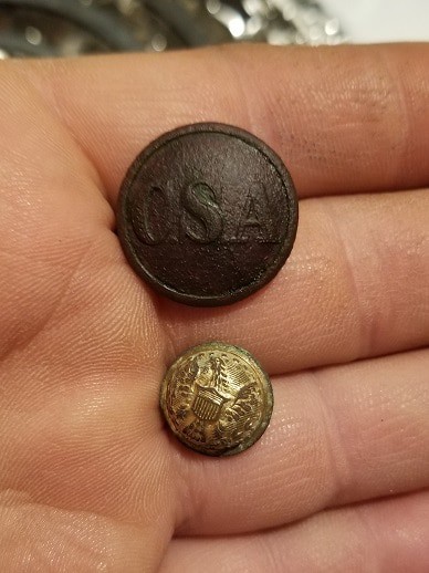 John: This is a tough question. There have been things I’ve found that were small and simple little items that carried great historical value and others that carried great emotional value, some of fair monetary value. I’m gonna go with a group of items I found in Westminster, that had my hands and voice shaking, due to the sheer surprise of the finds where I found them. While practicing using my new AT Pro in a little cut of public property between a housing development and strip mall, I found a civil war trash pit that produced a beautiful breastplate, US buckle, and scabbard tip. Prior to this I had found a set of keys, some modern clad, pop tops and pull-tabs. Complete and utter surprise, I was a wreck. Later on I found a bunch of other civil war relics in the area once I learned the machine better.