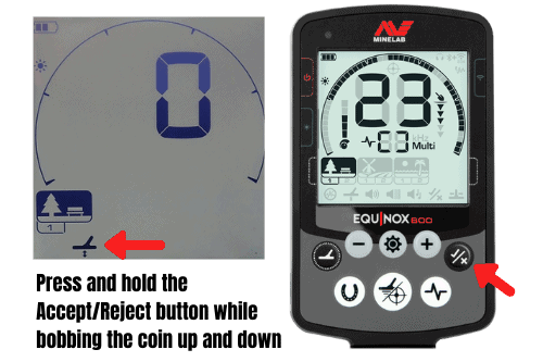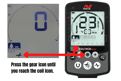 Automatic. This is by far the most popular and easiest way to ground balance the Equinox. To do so, press the gear/settings icon so that it is positioned under the “Ground Balance” menu item. Press and hold the Accept/Reject button and lift the coil up and down off the ground repeatedly until you see the numbers on the screen remain the same. The numbers will change at first but once they remain the same for several seconds, release the Accept/Reject button. The ground balance will be set correctly. Now lets talk about “Tracking“.