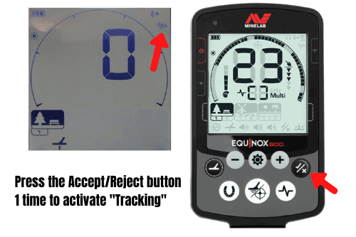 Tracking. I do not recommend using tracking to ground balance the Equinox. The performance of the Equinox will be impacted by using this technique. However, if you run into a condition where the soil conditions are changing a lot, tracking may help keep the machine stable. To enable tracking, press the gear/settings icon so that it is positioned under the “Ground Balance” menu item. Press the Accept/Reject button 1 time. You will see an icon appear like the one pictured in the image below. That is your indication that tracking is turned on. To turn it off, repeat the same procedure again. Once you hit the Accept/Reject button the tracking icon should disappear.