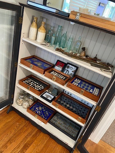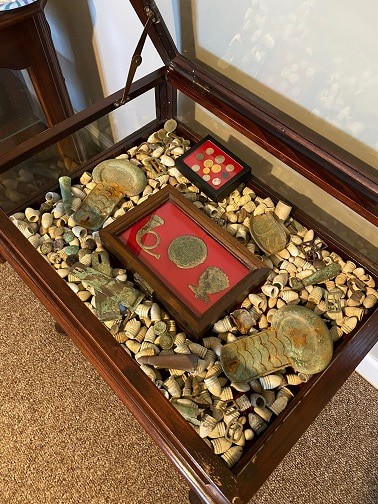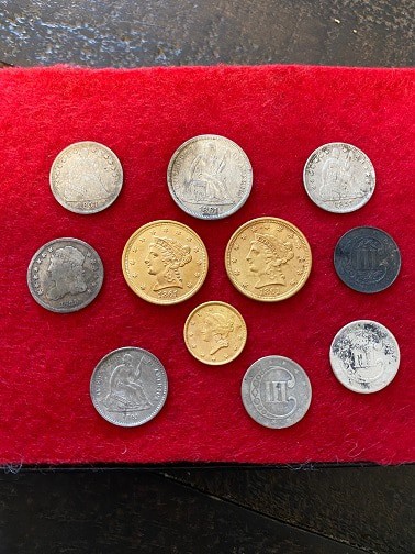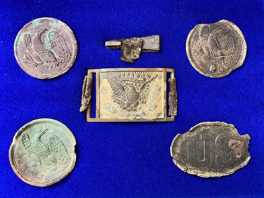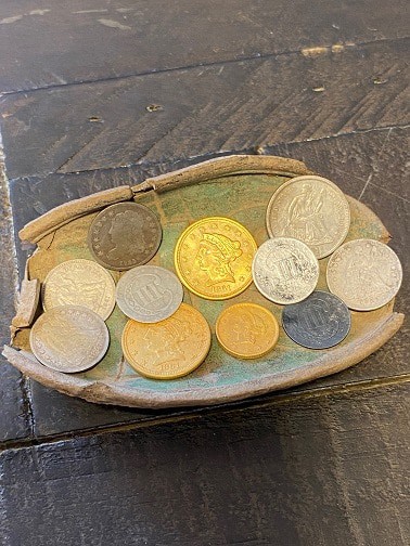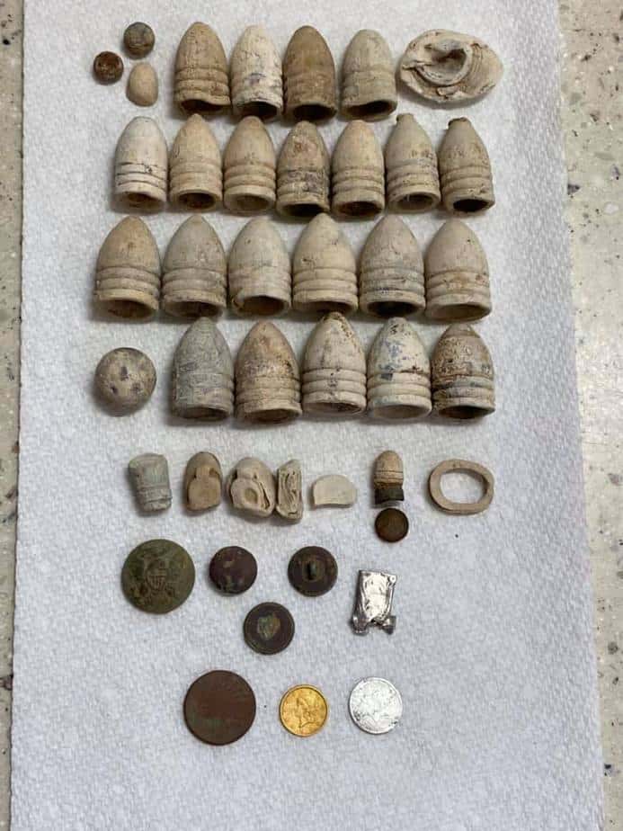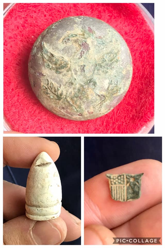 Michael: Confederate button, US buckle, Artillery shell, 1700’s US silver coin, and a US 2 cent piece
